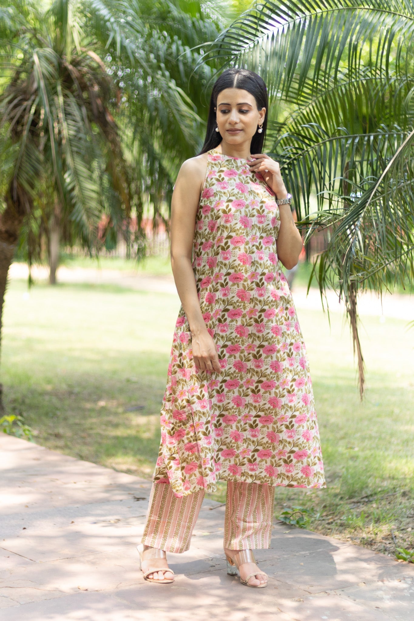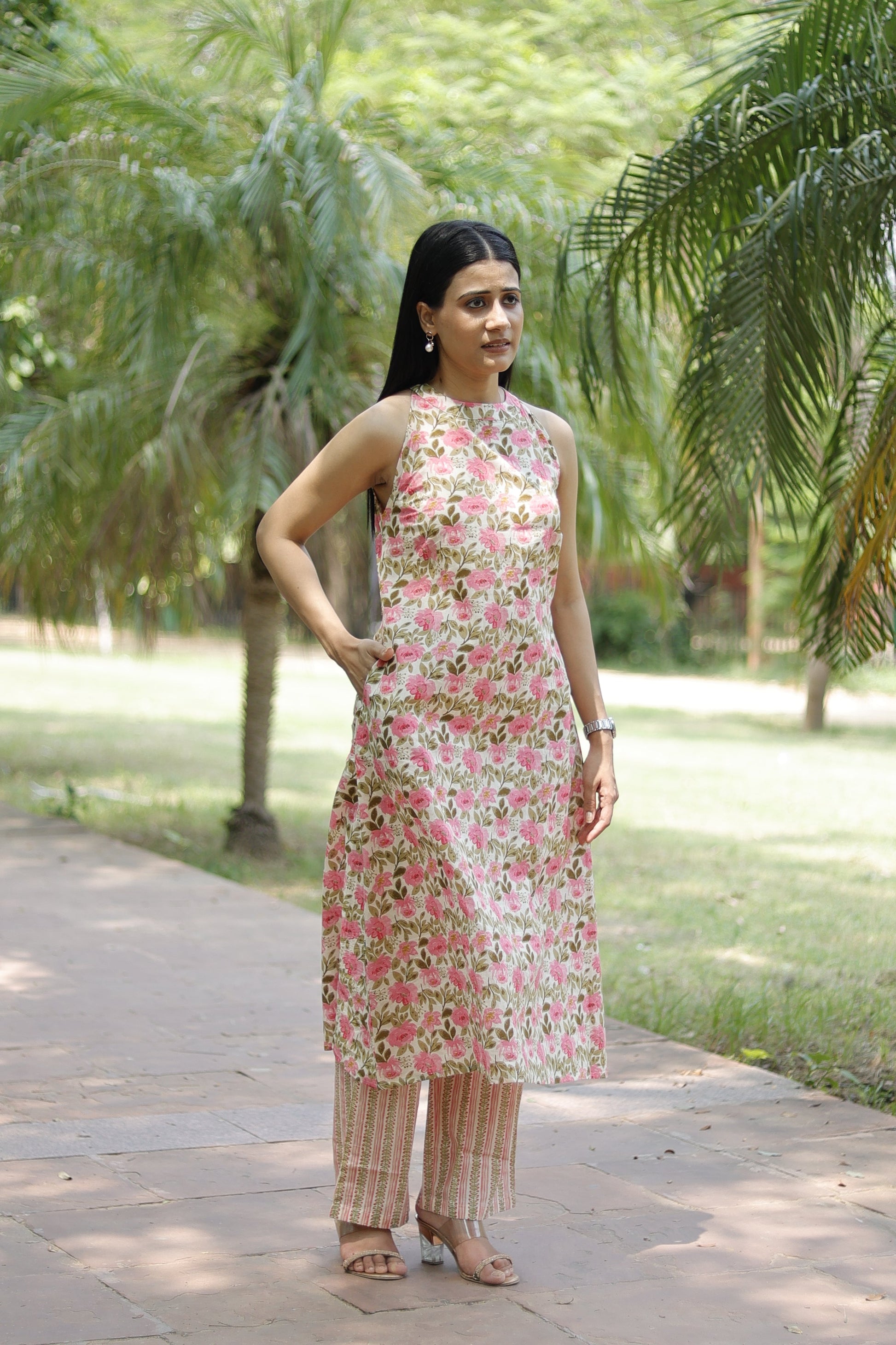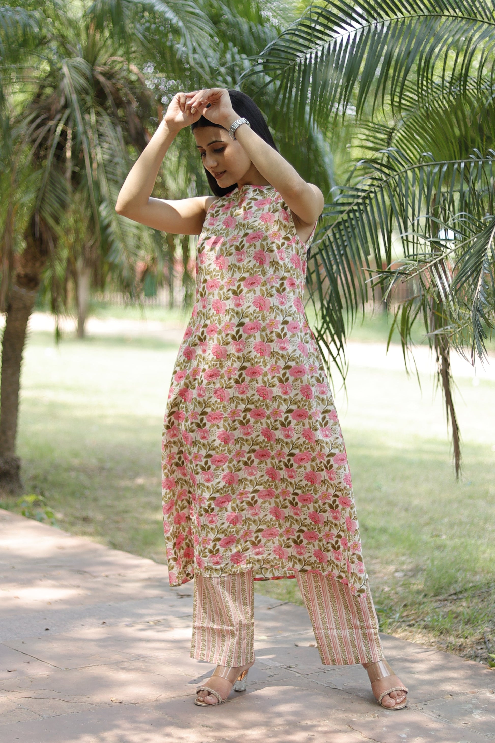 100% cotton Pink Rose printed cord-set, completely hand printed blocked look prints perfect for your everyday wear use. This set has an button at the back to adjust the neck, the set comes with both side pocketed kurta and pants as well. Crafted with love for the love of cotton