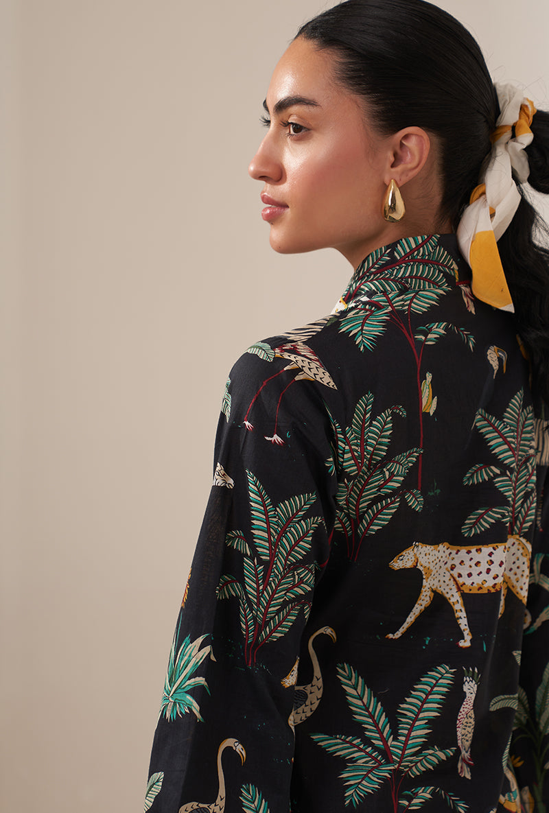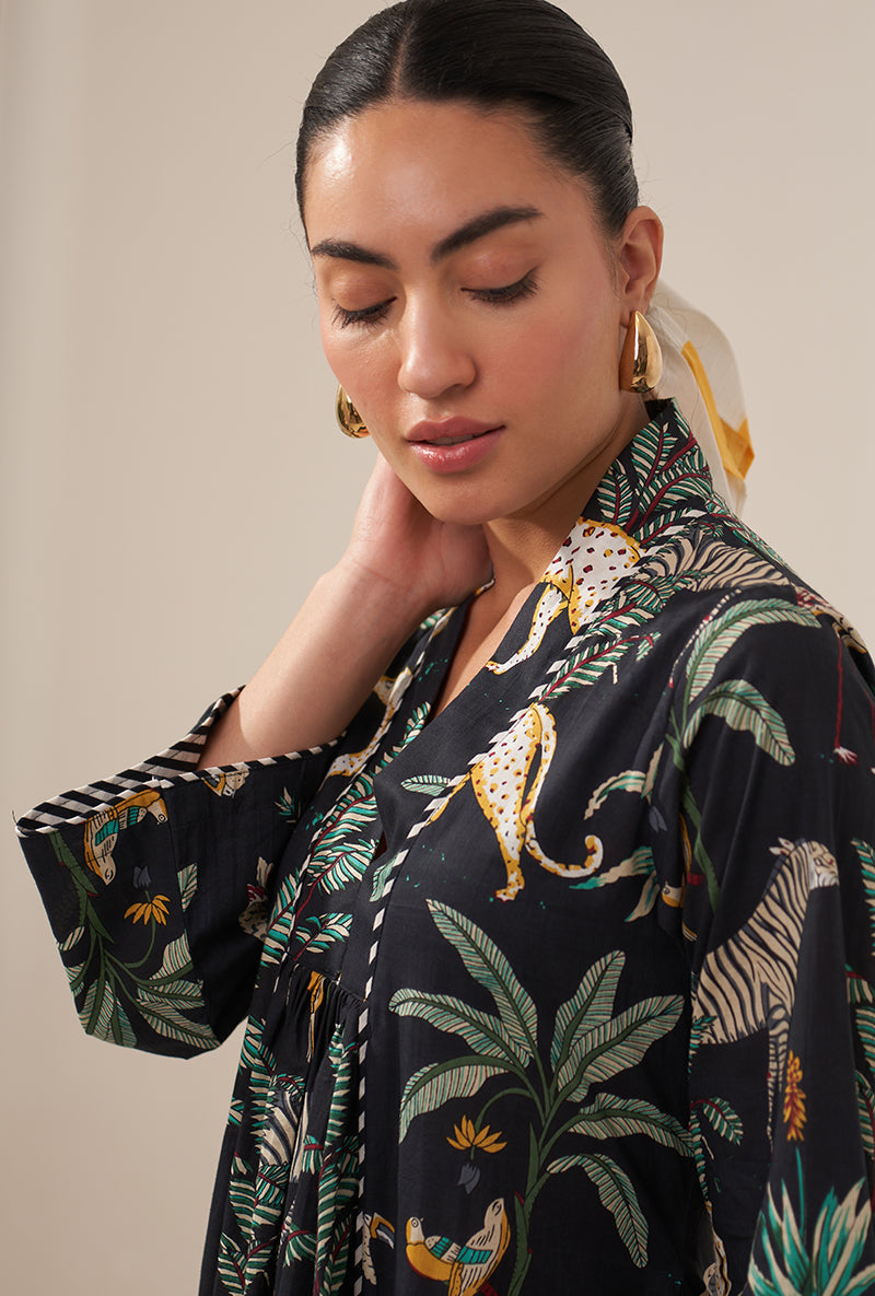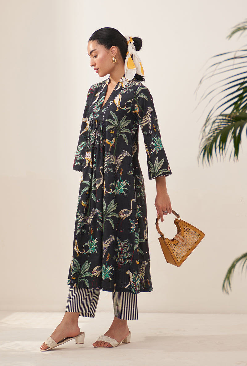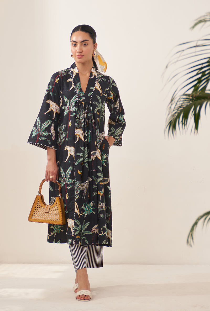 This 2-piece set features a tropical all-over print, a flattering V-neckline, and gathers in the front, accented with contrast piping along the neckline, centre, and sleeve hems. Additionally, it boasts convenient side pockets for added functionality. The top is perfectly paired with striped pants, creating a stylish and coordinated ensemble.