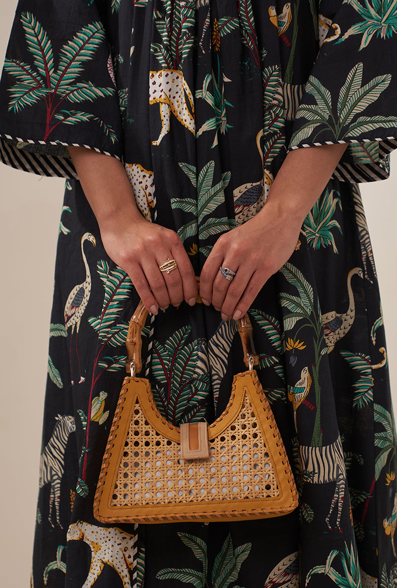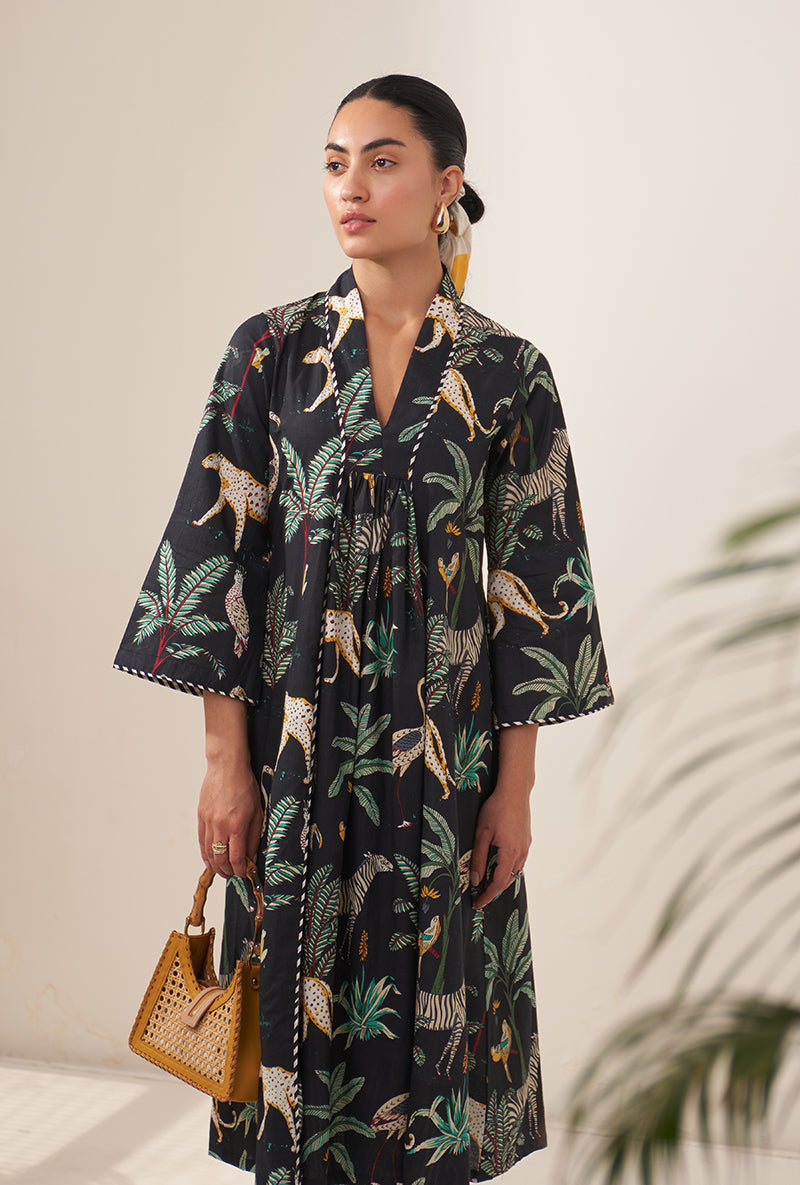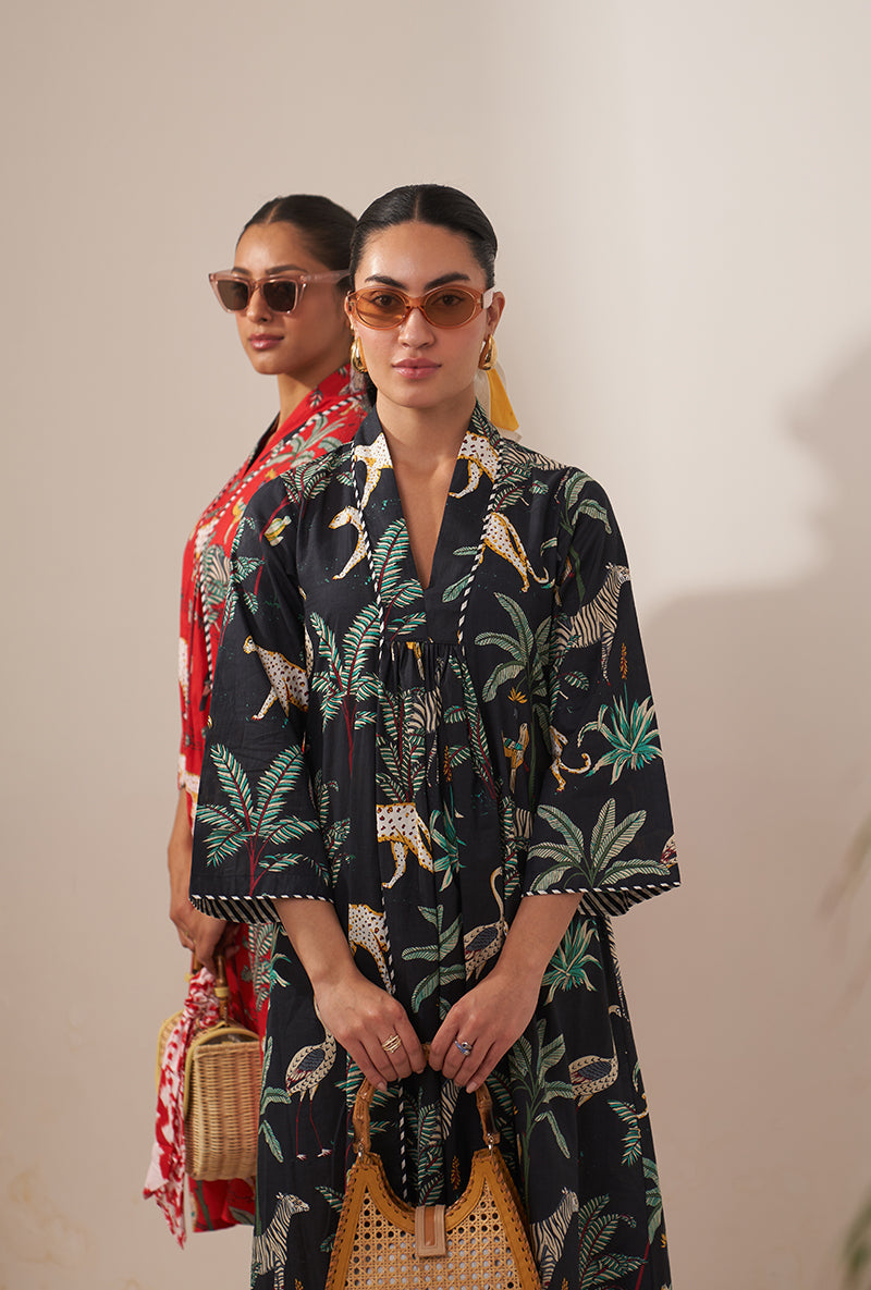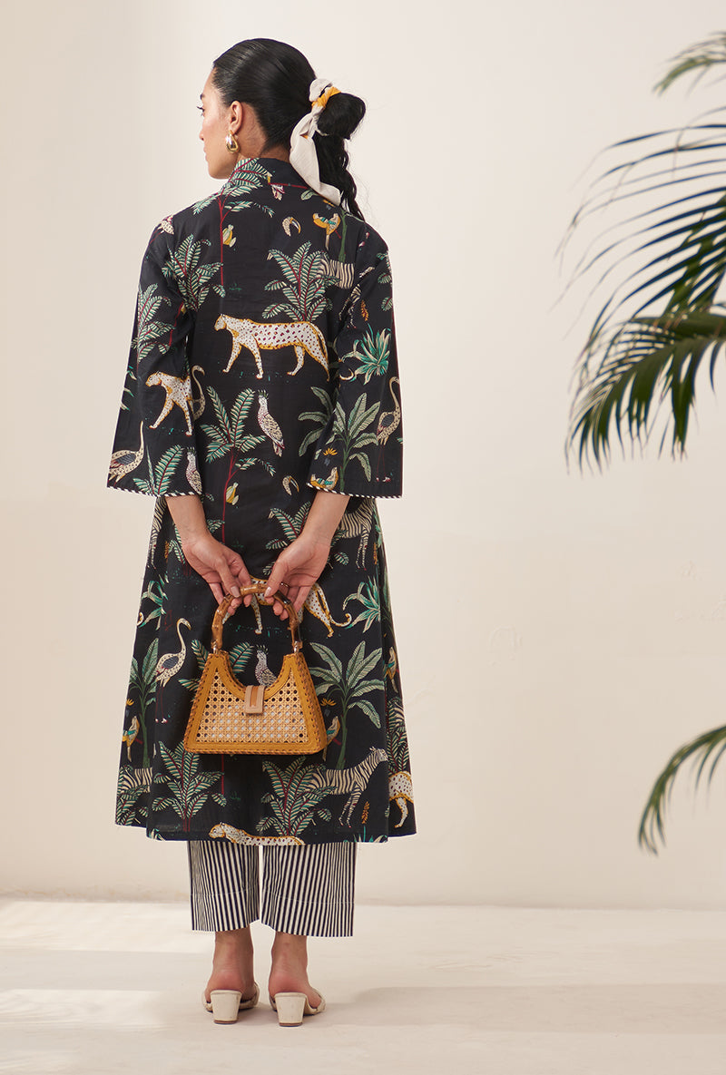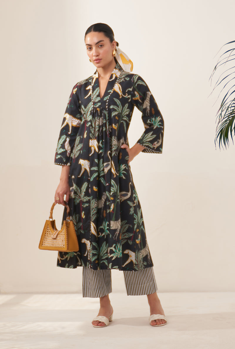 This 2-piece set features a tropical all-over print, a flattering V-neckline, and gathers in the front, accented with contrast piping along the neckline, centre, and sleeve hems. Additionally, it boasts convenient side pockets for added functionality. The top is perfectly paired with striped pants, creating a stylish and coordinated ensemble.