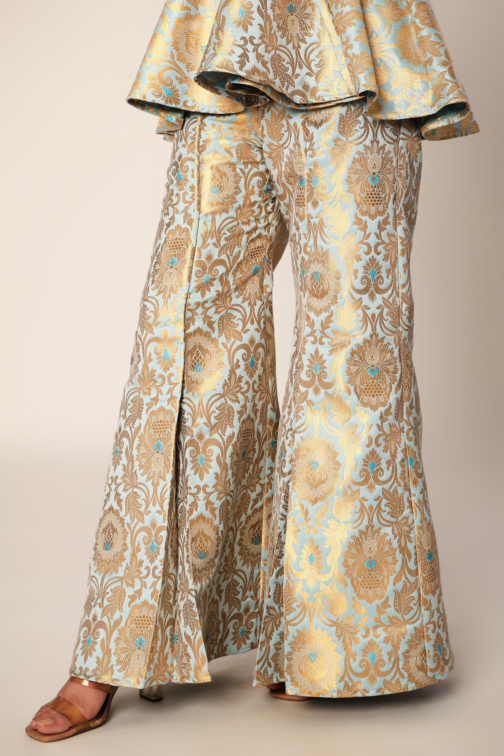 Turn heads in this luxe pure Banarasi brocade set featuring a chic kimono-style peplum top with flared pants. Soft cotton lining ensures comfort, while golden floral motifs bring timeless elegance — perfect for weddings & festive celebrations.