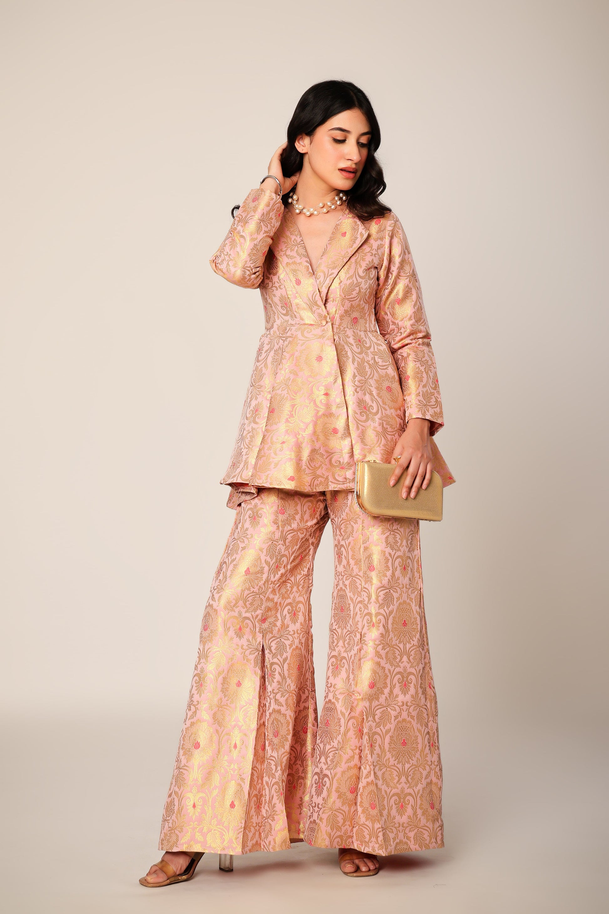Turn heads in this luxe pure Banarasi brocade set featuring a chic kimono-style peplum top with flared pants. Soft cotton lining ensures comfort, while golden floral motifs bring timeless elegance — perfect for weddings & festive celebrations.