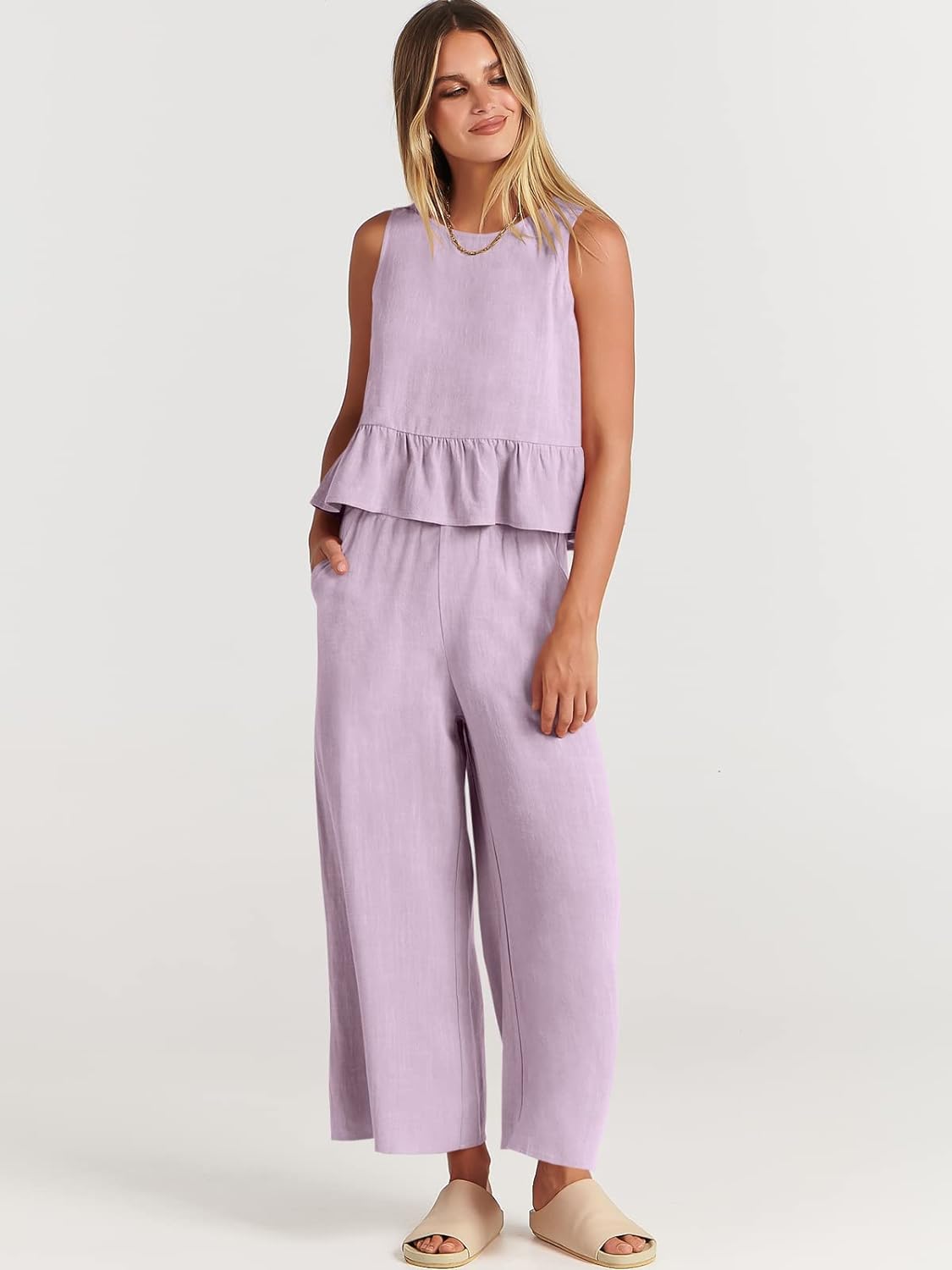 100% Viscose Linen Two Piece Coord set - Ruffles Crop Top & Wide Leg Pants - Lilac