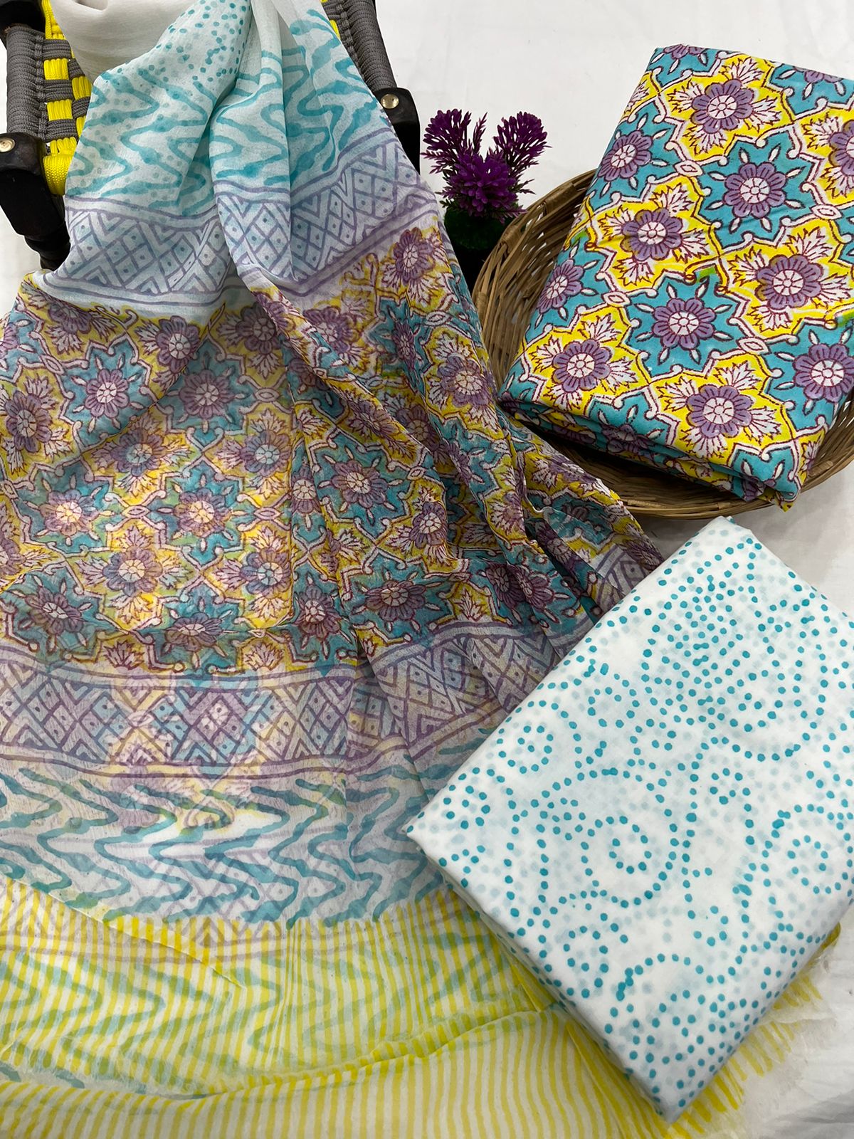 Exclusive hand block printed Cotton Suit set with chiffon Dupatta