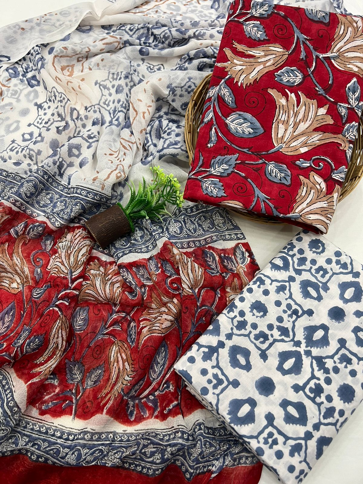 Exclusive hand block printed Cotton Suit set with chiffon Dupatta