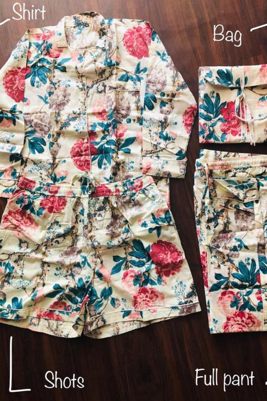 Featuring an off-white floral printed soft cotton pyjama and shorts set.