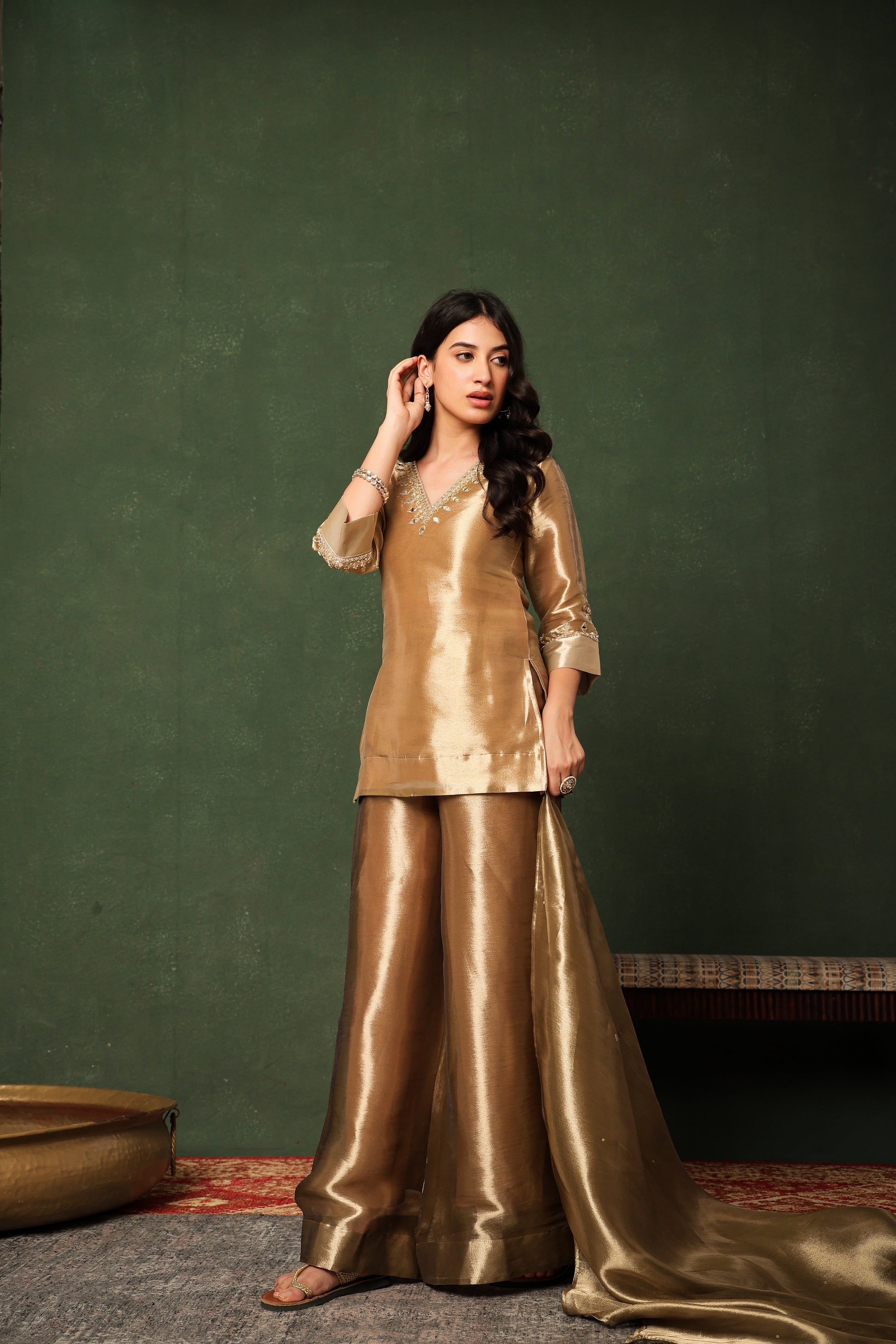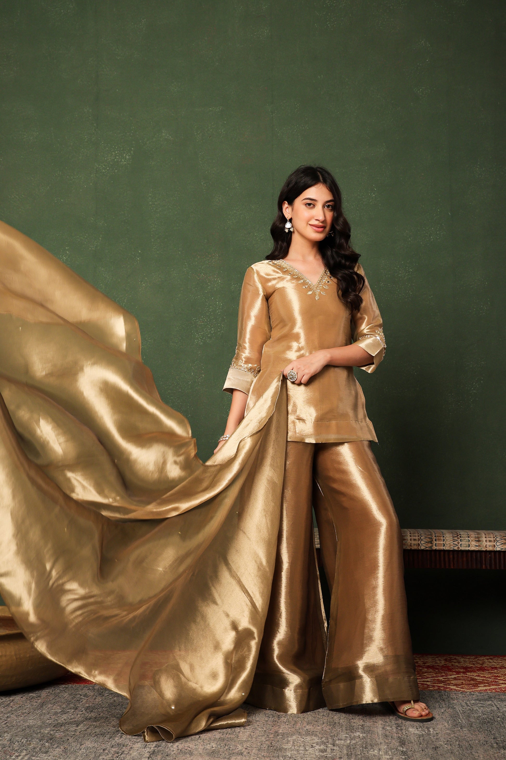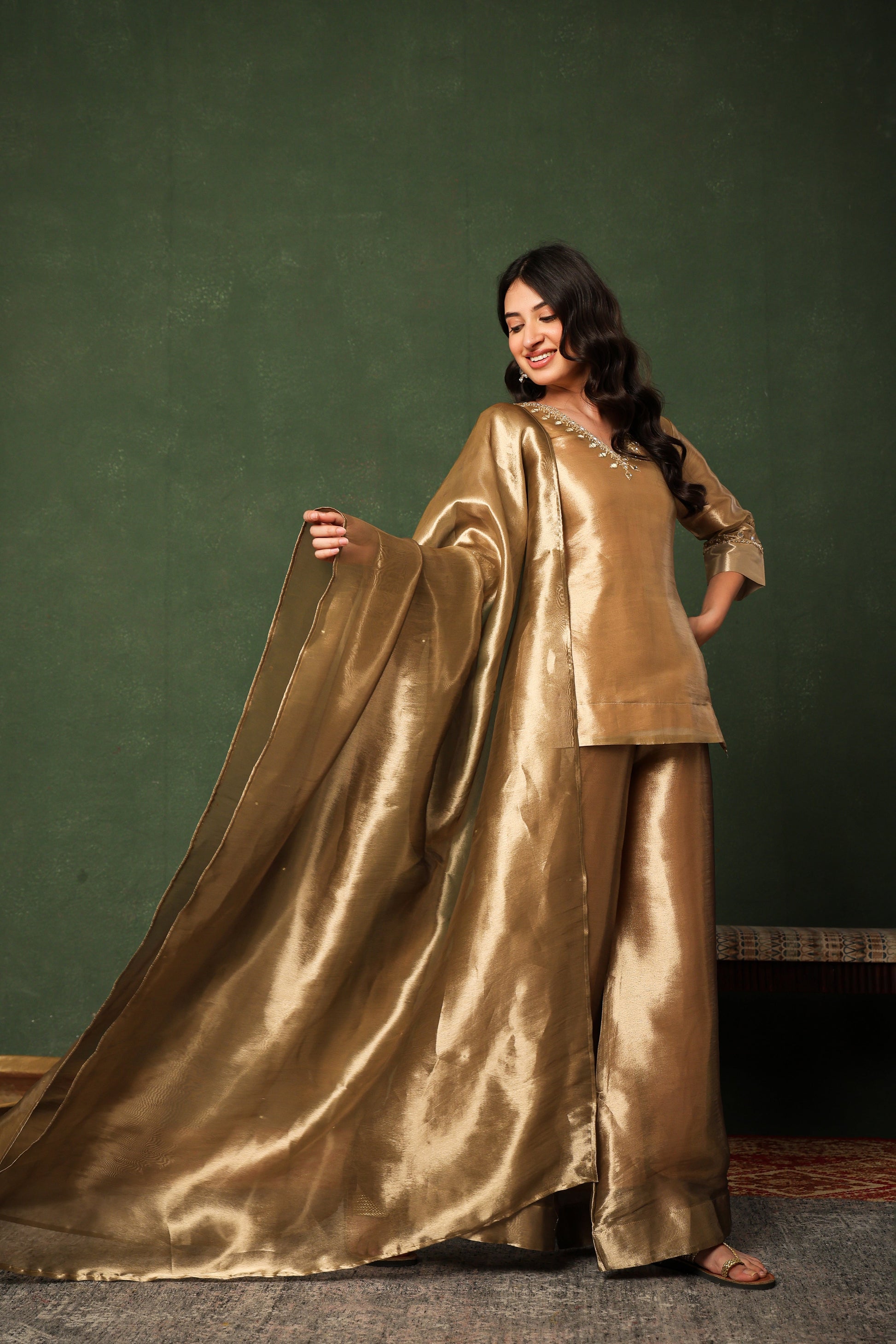 Elevate your festive and occasion wear wardrobe with this exquisite ensemble crafted in pure tissue fabric. The set features a straight kurta paired with wide-leg pants and a flowing tissue dupatta that adds effortless grace. The neckline is delicately adorned with intricate handwork, lending a touch of timeless charm.