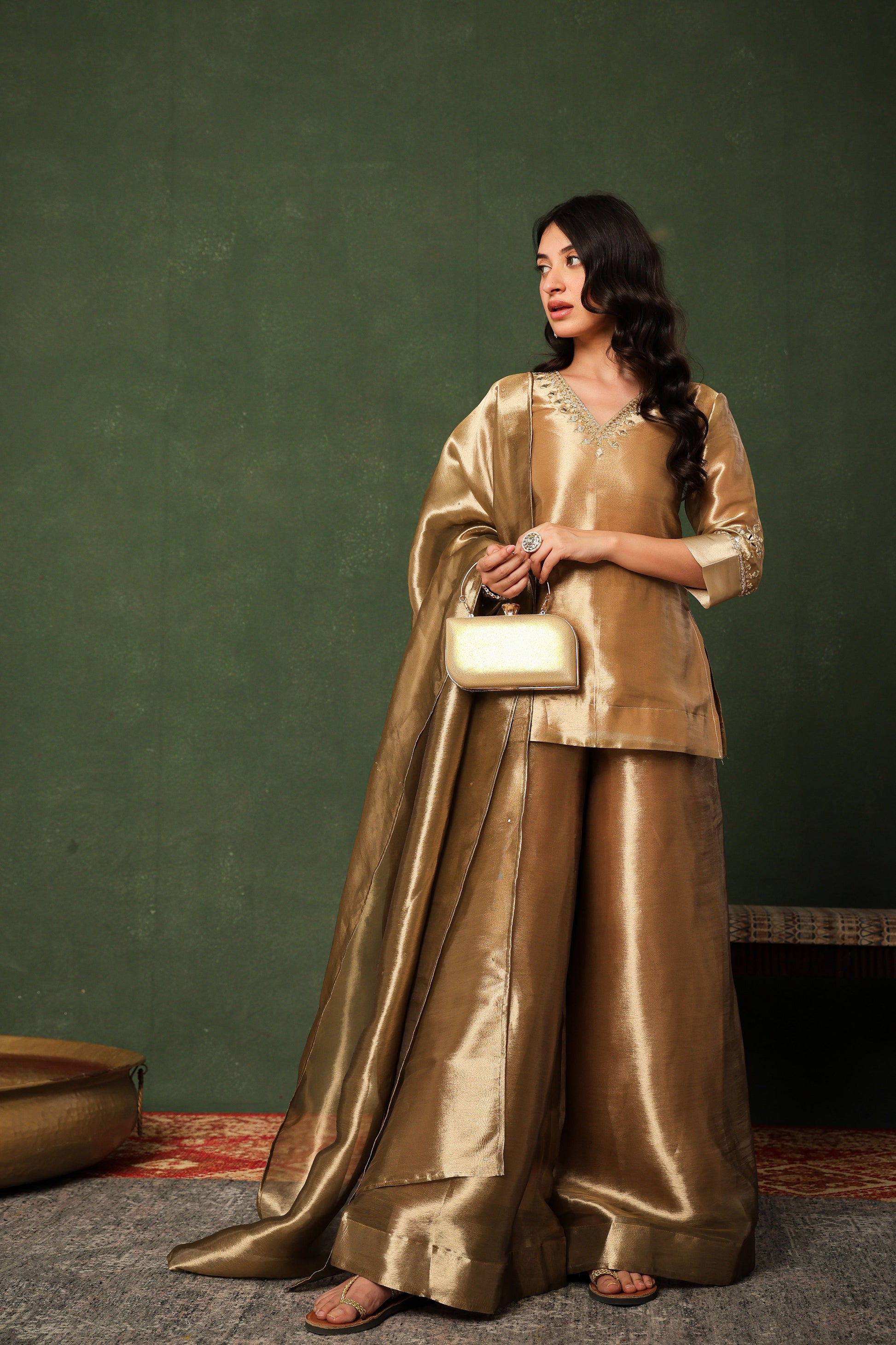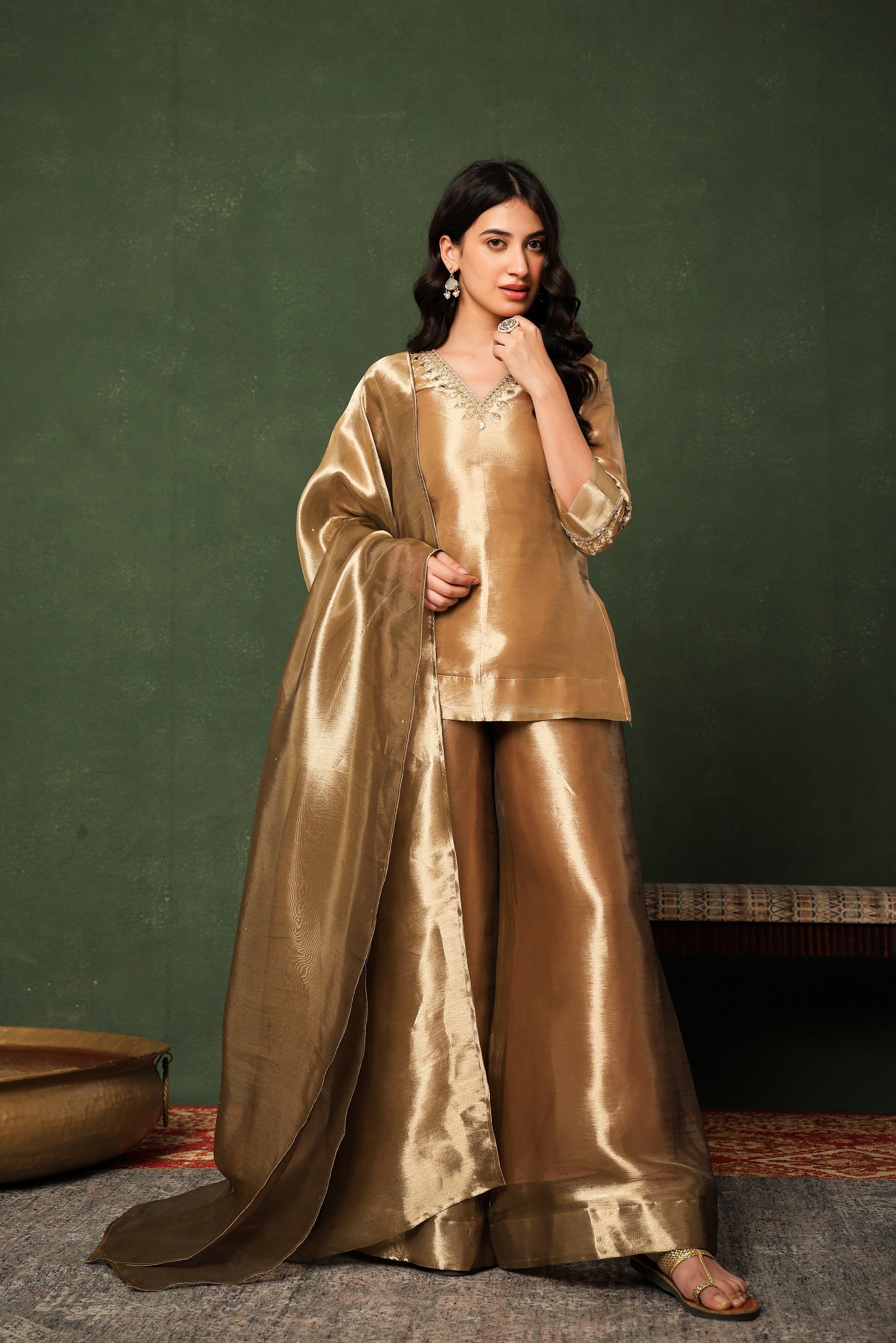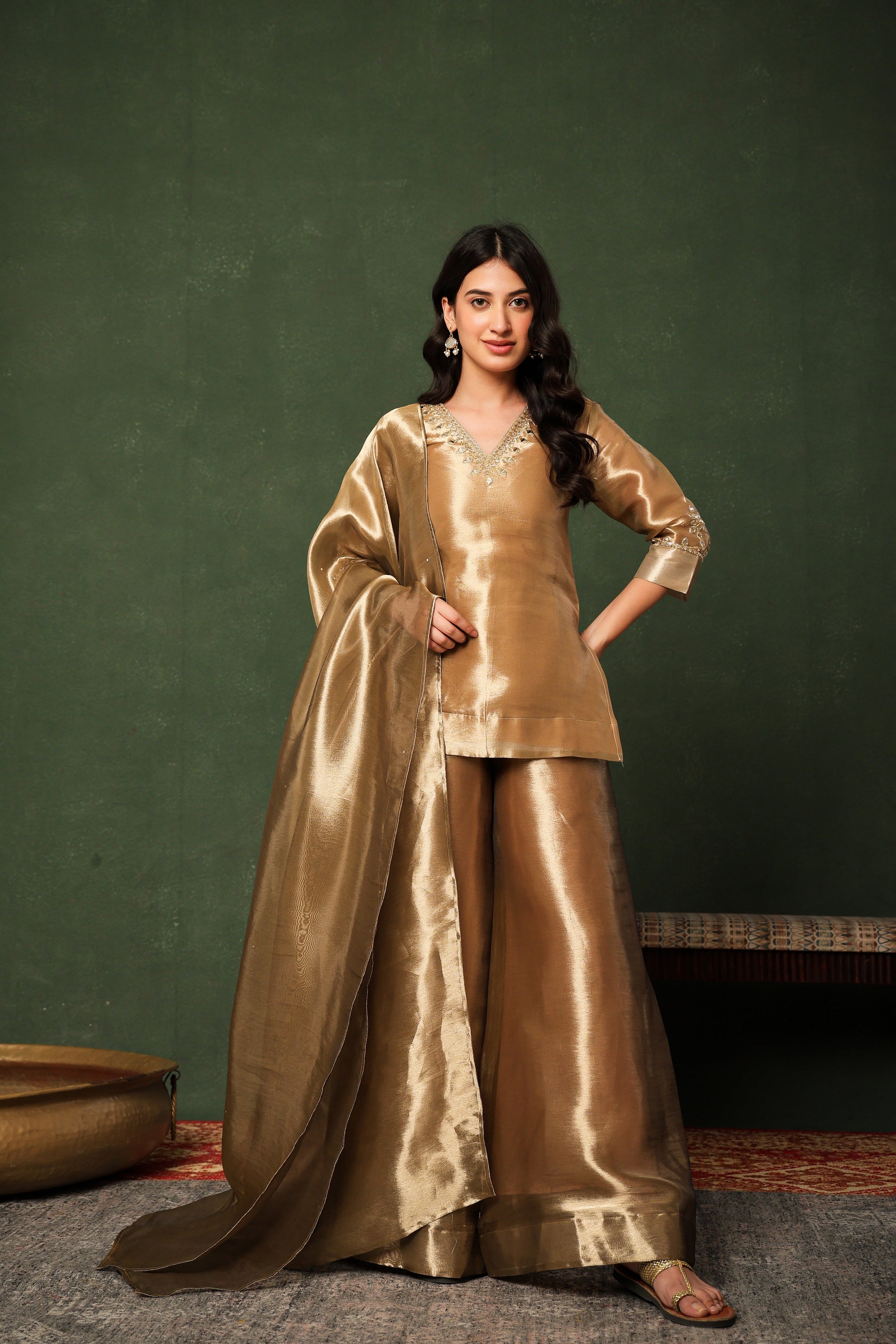 Elevate your festive and occasion wear wardrobe with this exquisite ensemble crafted in pure tissue fabric. The set features a straight kurta paired with wide-leg pants and a flowing tissue dupatta that adds effortless grace. The neckline is delicately adorned with intricate handwork, lending a touch of timeless charm.