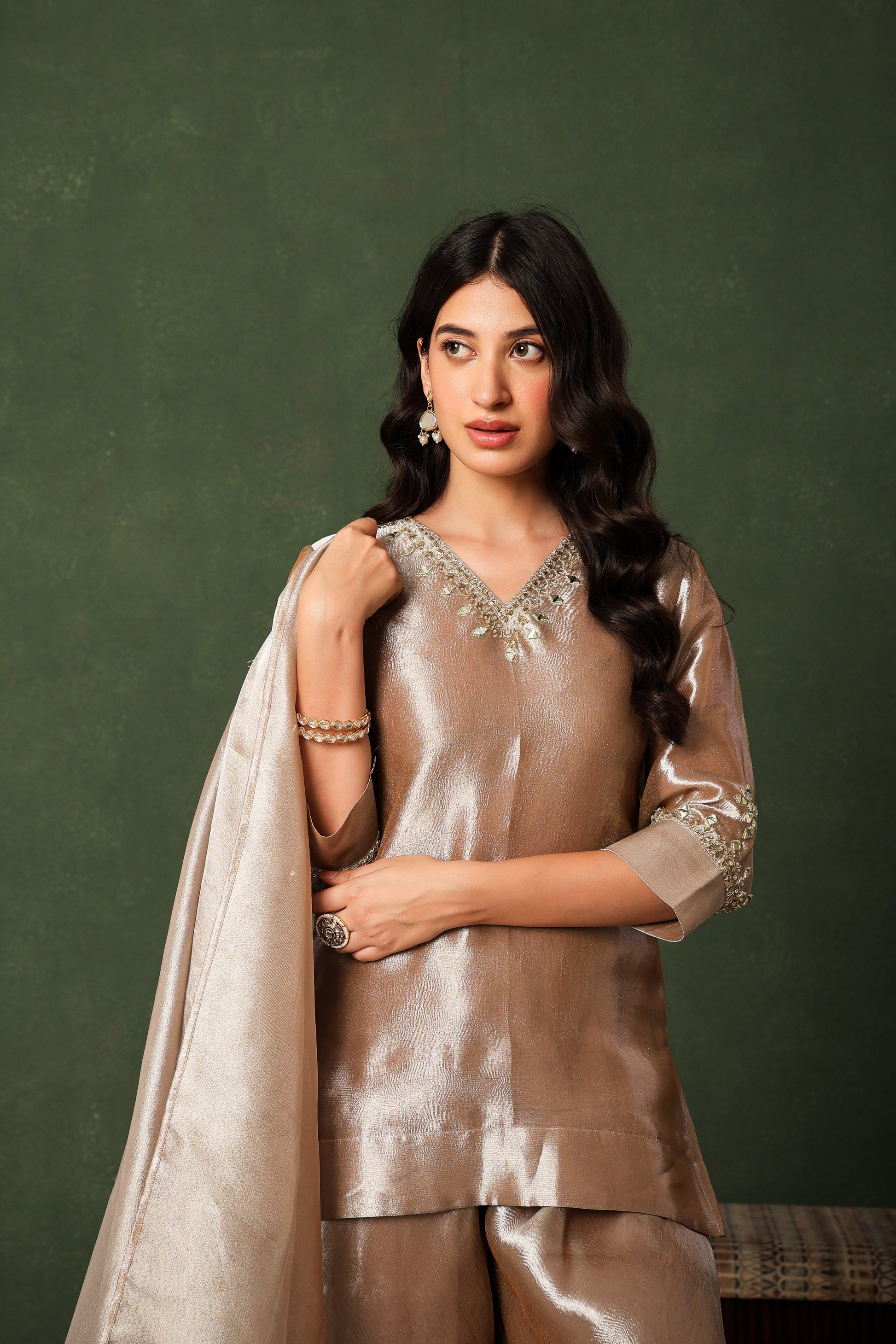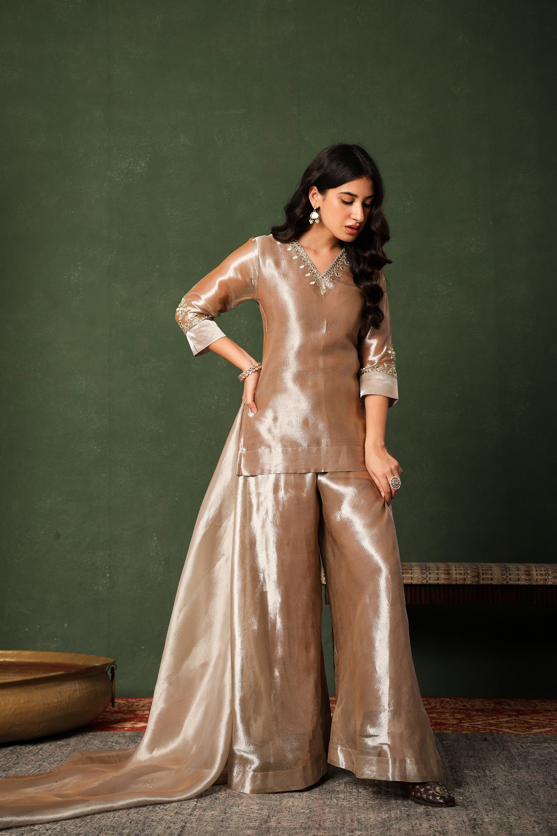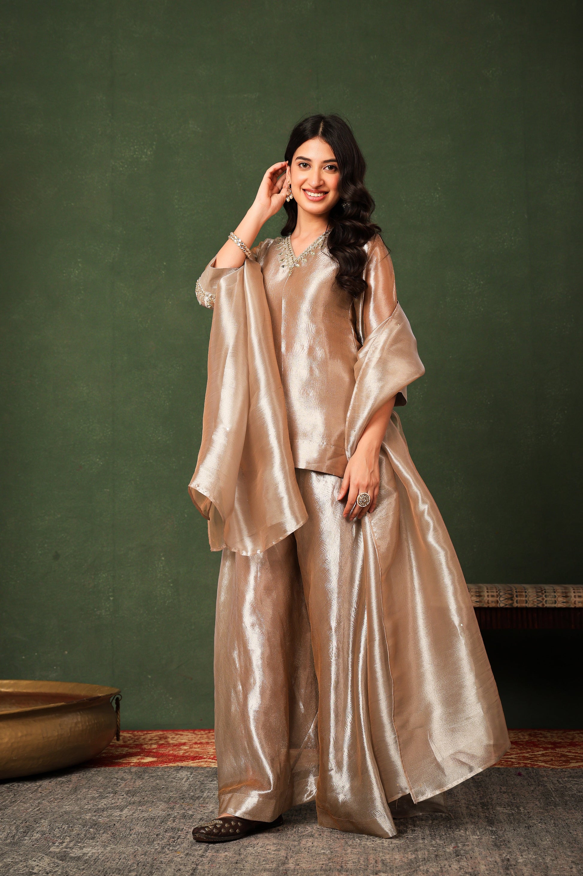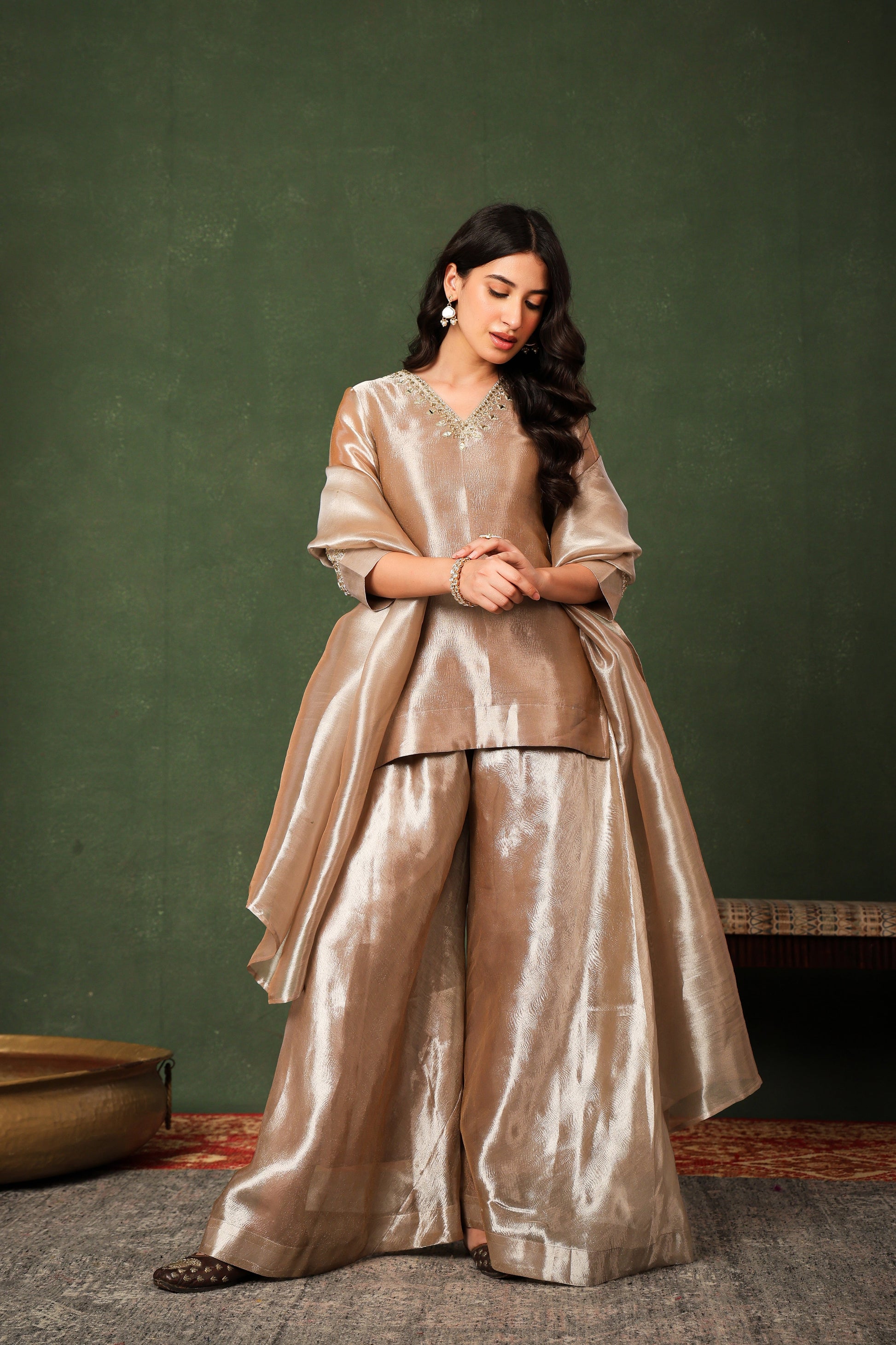 Elevate your festive and occasion wear wardrobe with this exquisite ensemble crafted in pure tissue fabric. The set features a straight kurta paired with wide-leg pants and a flowing tissue dupatta that adds effortless grace. The neckline is delicately adorned with intricate handwork, lending a touch of timeless charm.