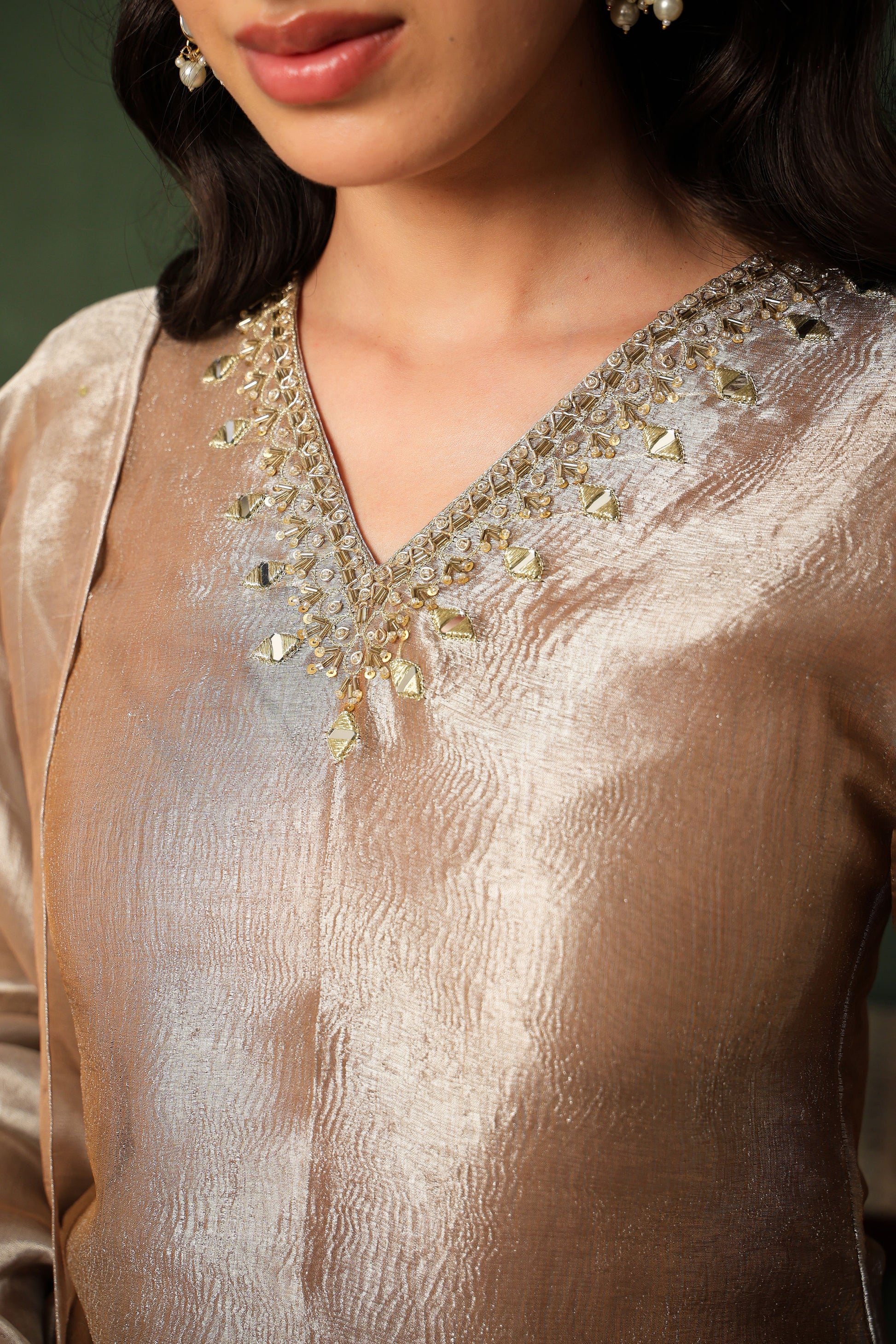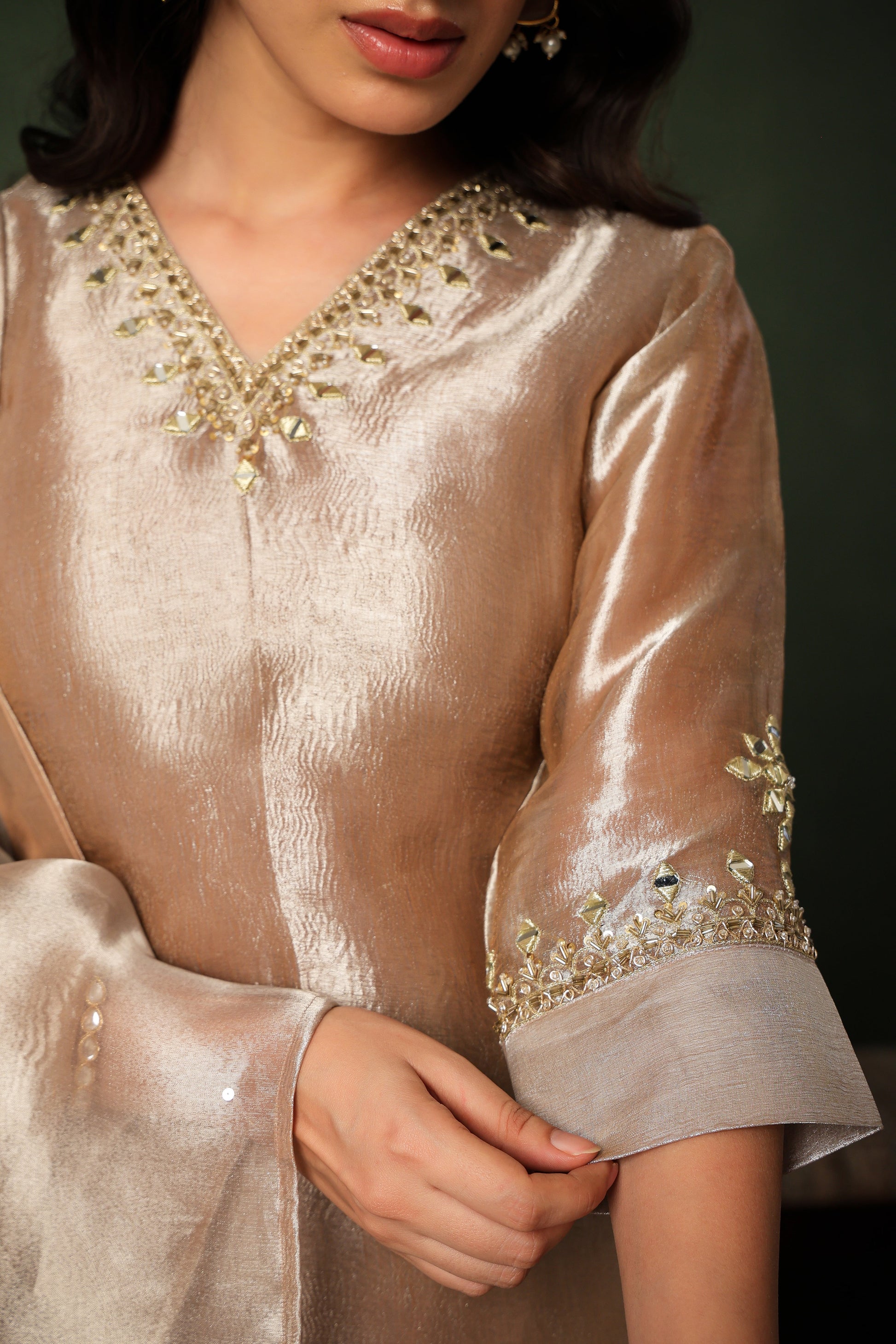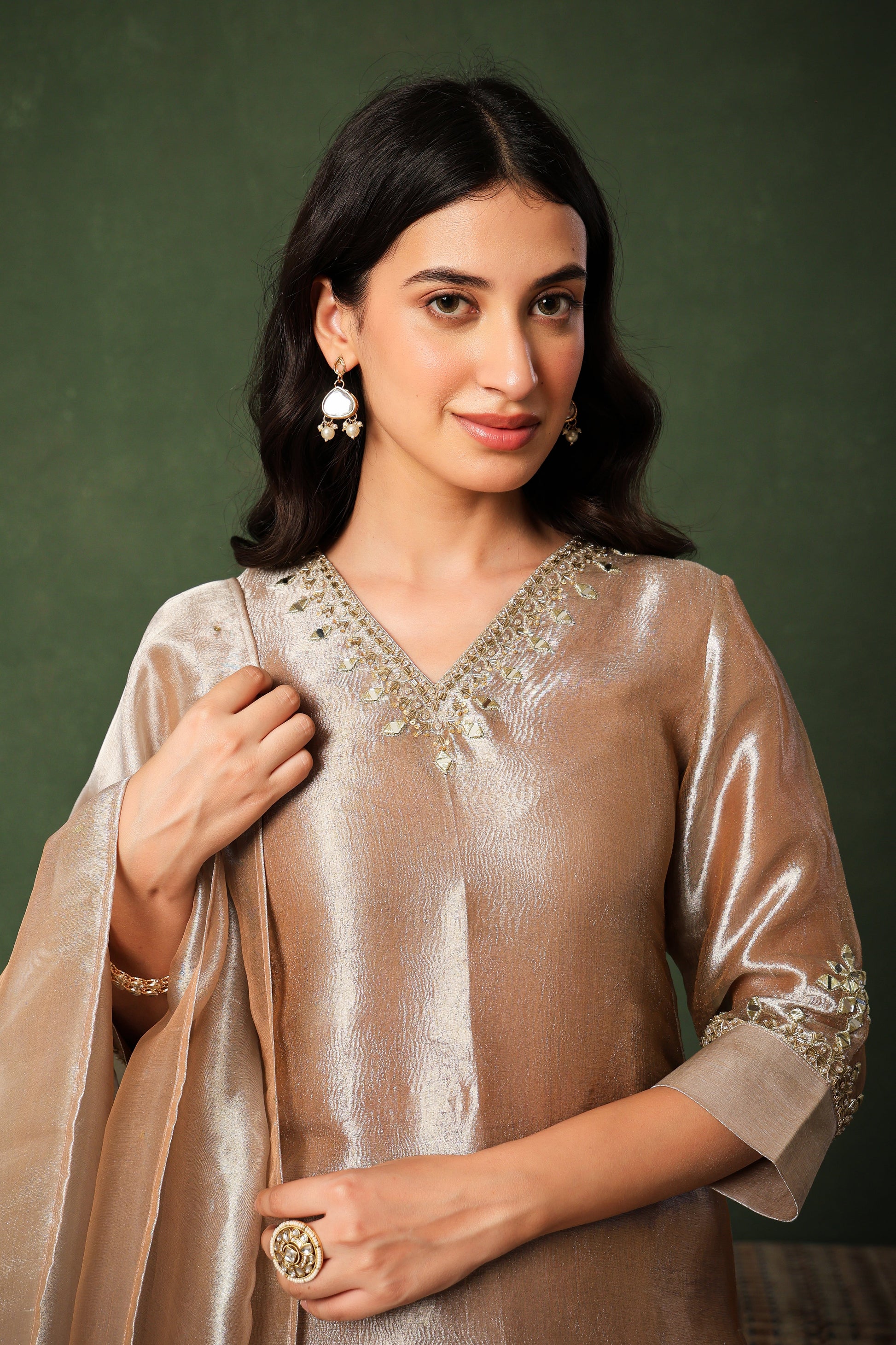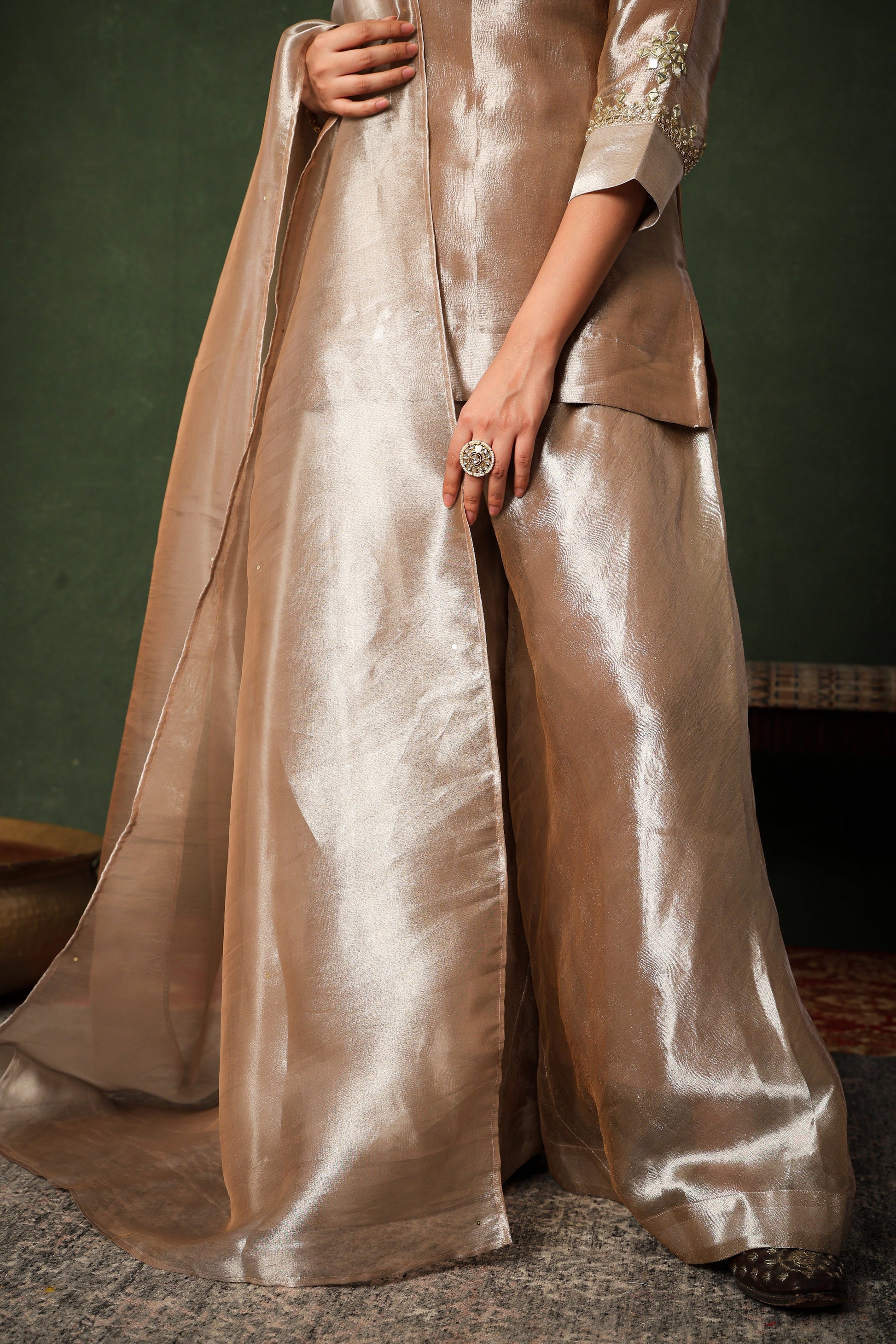 Elevate your festive and occasion wear wardrobe with this exquisite ensemble crafted in pure tissue fabric. The set features a straight kurta paired with wide-leg pants and a flowing tissue dupatta that adds effortless grace. The neckline is delicately adorned with intricate handwork, lending a touch of timeless charm.