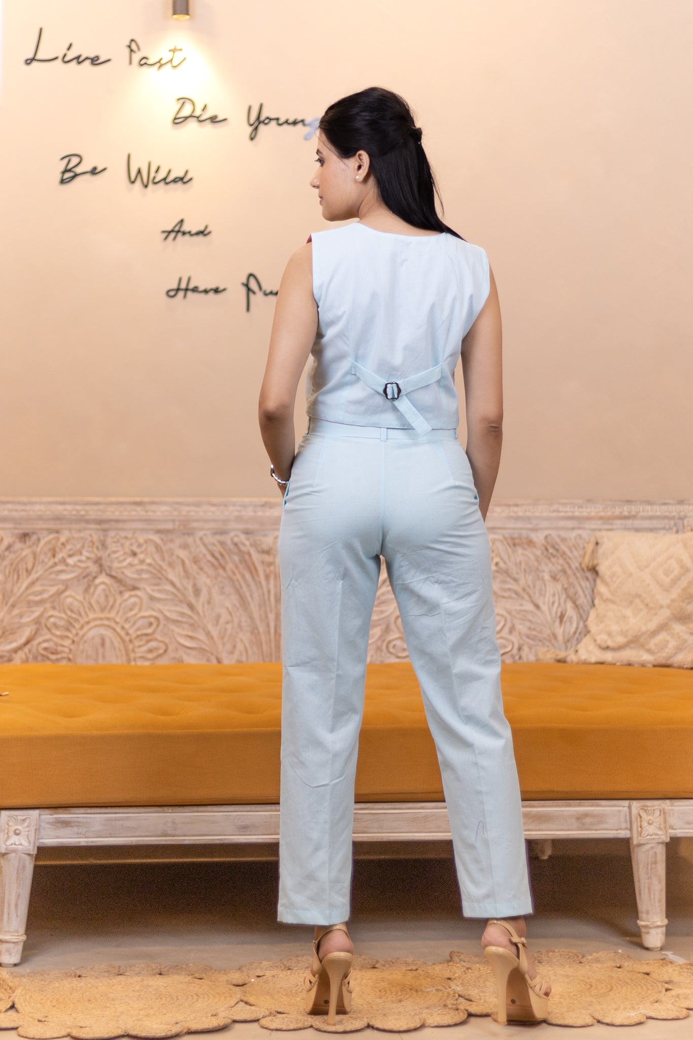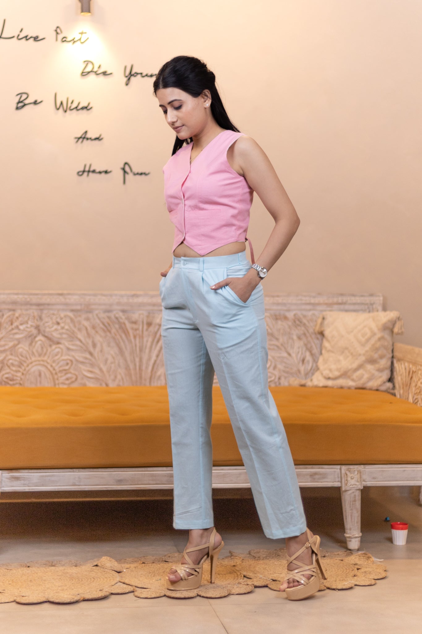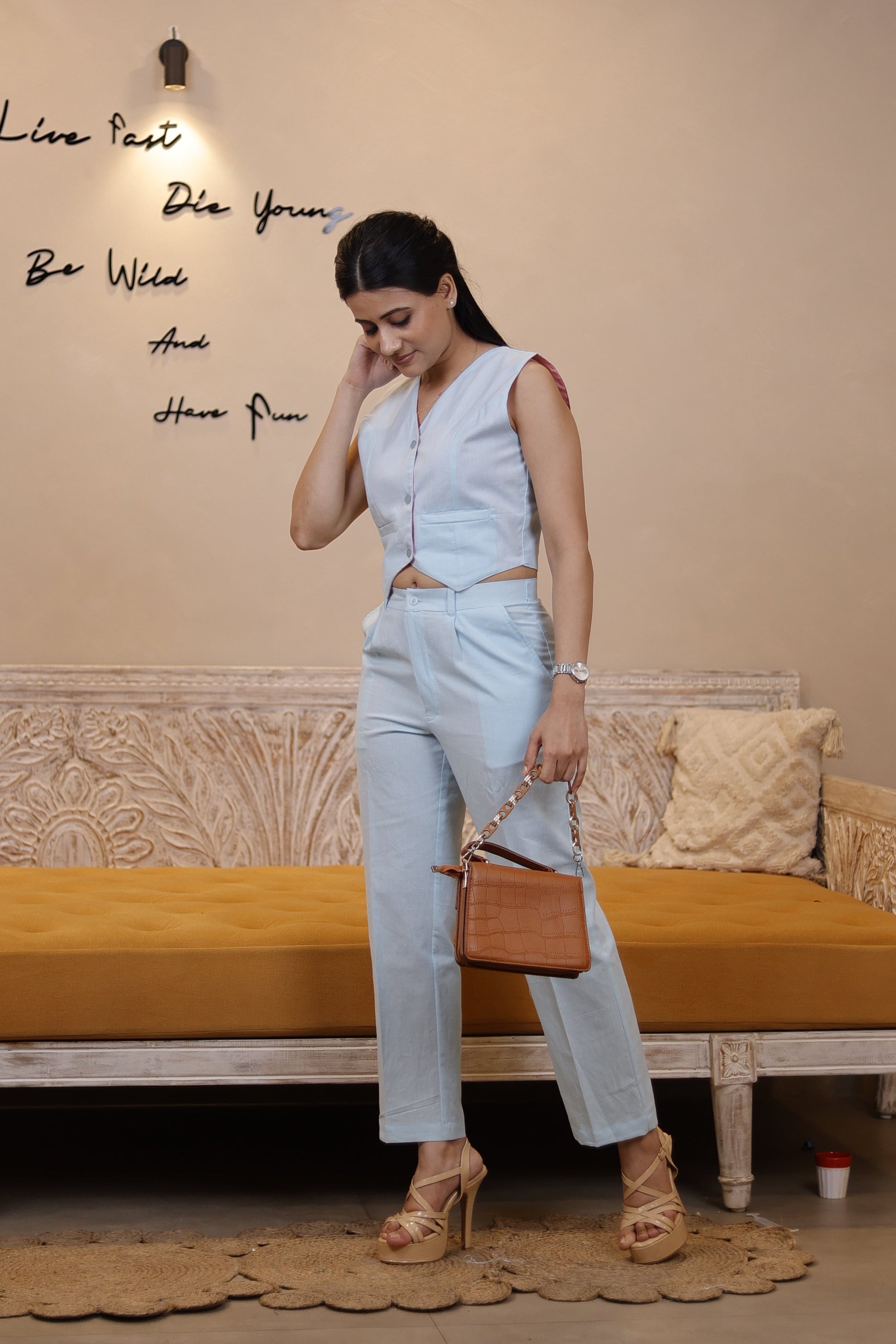 The ultimate go to wear Vest and trending Coords are here, here comes the trendy airy Linen Vest Coat and trouser where in we have the comfort of Linen and the all occasion look may it be office meeting or a casual ootd. The Vest is reversible in nature and can be used both ways, Vest comes with a belt to adjust the waist size according to your comfort and pockets to hold up your little touch-ups. Pants have both side pockets and are high waisted to be the perfect fit. The set can be paired with office wear and both Vest and Trousers can be paired with your daily outfits as well. This is the one in all for your smartest wardrobe choice